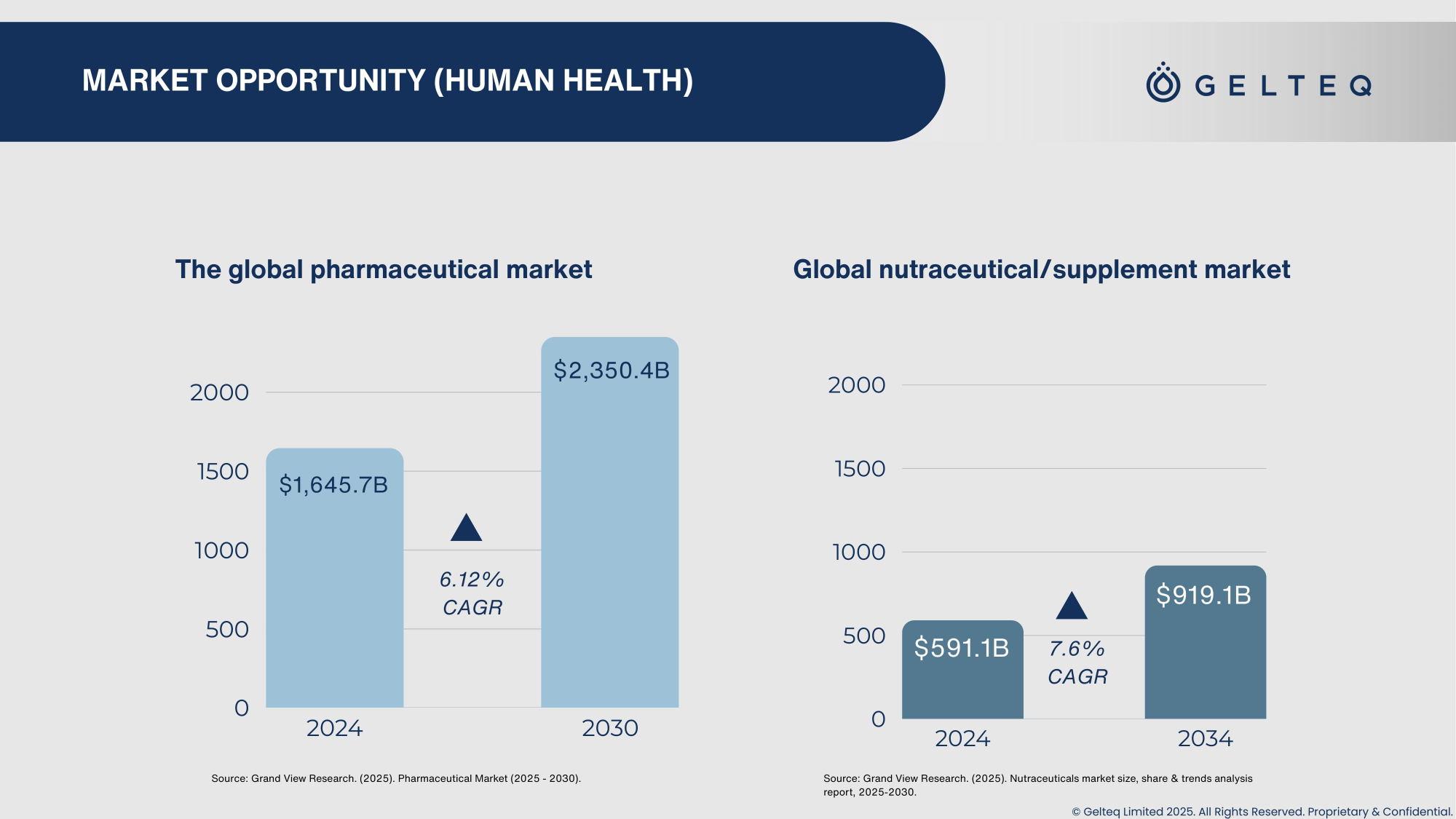 2024 2030 0 500 1000 1500 2000 2024 2034 0 500 1000 1500 2000 MARKET OPPORTUNITY ( HUMAN HEALTH ) The global p ha r mace ut ical ma r ke t Global n utr ace ut ical / supp lemen t ma r ke t $ 1 , 645.7 B $ 591.1 B 6.12 % CAGR 7.6 % CAGR $ 2 , 350.4 B $ 919.1 B So ur ce: G r and Vie w Re s ea r ch . ( 2025 ) . N utr ace ut ical s ma r ke t s i z e, s ha r e & tr end s anal ys i s r e p o rt , 2025 - 2030. © Gelteq Limited 2025. All Rights Reserved. Proprietary & Confidential. So ur ce: G r and Vie w Re s ea r ch . ( 2025 ) . Pha r mace ut ical Ma r ke t ( 2025 - 2030 ) .